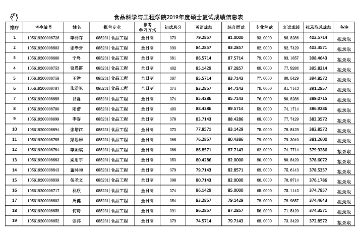 完整版请查看附件:食品科学与工程学院2019年硕士研究生招生复试成绩公示.pdf