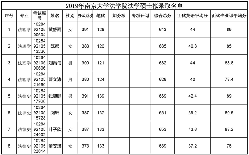 以上是聚创考研网为考生整理的"2019年南京大学法学院法学硕士拟录取名单"的相关考研信息,希望对大家考研备考有所帮助! 备考过程中如有疑问,也可以添加老师微信juchuang911进行咨询。